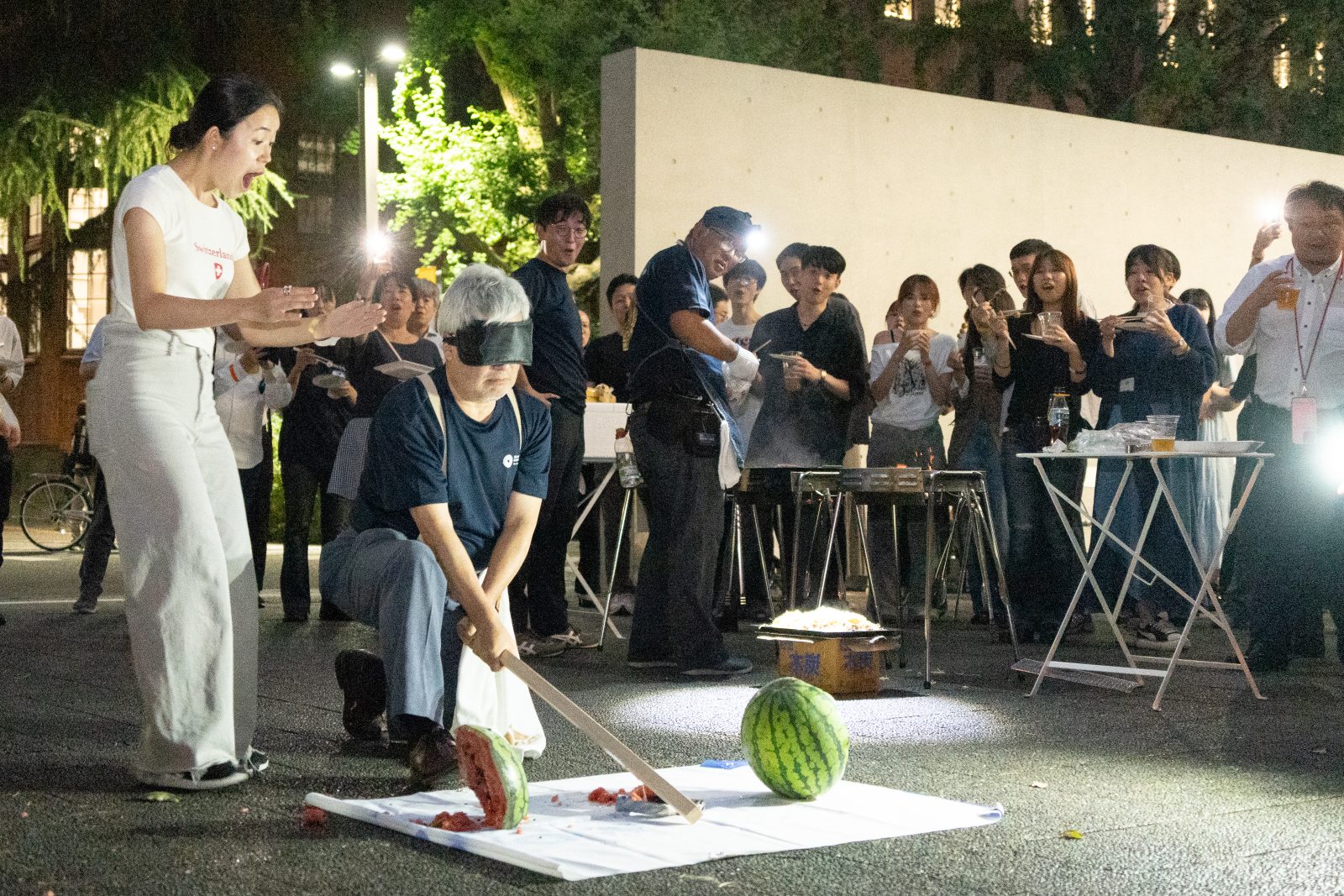 当日は、ドリンクに加え、BBQや焼きそば、ボルシチも提供されました。余興として、教育部研究生・大学院生・教職員によるスイカ割りが行われ、会場は大いに盛り上がりました。